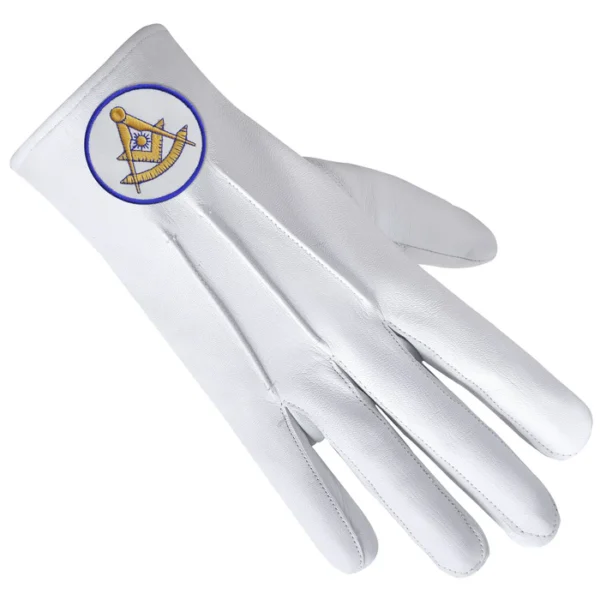 Master Mason Blue Lodge Gloves – White Leather with Blue Square & Compass